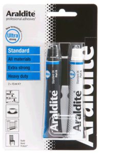 Araldite® Standard is a strong 2-component epoxy with long working time. Parts repositionable for 80 minutes. Oil, chemical and impact resistant. High temperature resistance (-30°C to 65°C). Withstands rough handling. Do not use to repair or bond items that will contact food or drink. Not recommended for bonding rear-view mirrors to car windscreens.