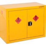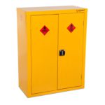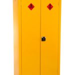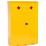 Safestor Hazardous floor cupboard, designed to be used internally for the safe storage of flammables and chemicals, such as paint and other hazardous substances as defined by COSHH guidelines. Built to a 30 minute fire resistant. Supplied with 1 galvanised shelf, Liquid-tight sump to contain spillages, Flush handles with two point locking, Reinforced doors, Powder coated paint finish, Relevant warning signs.